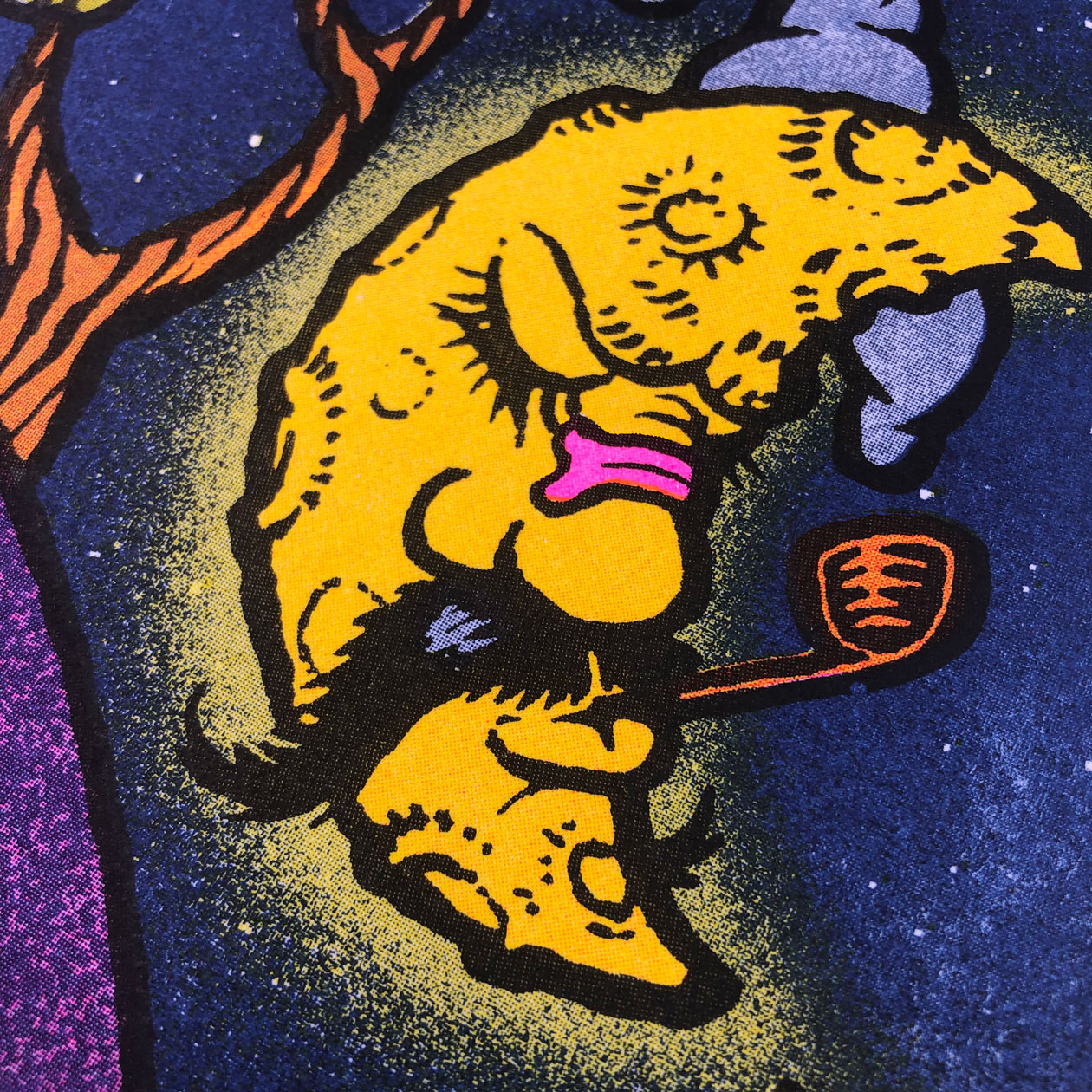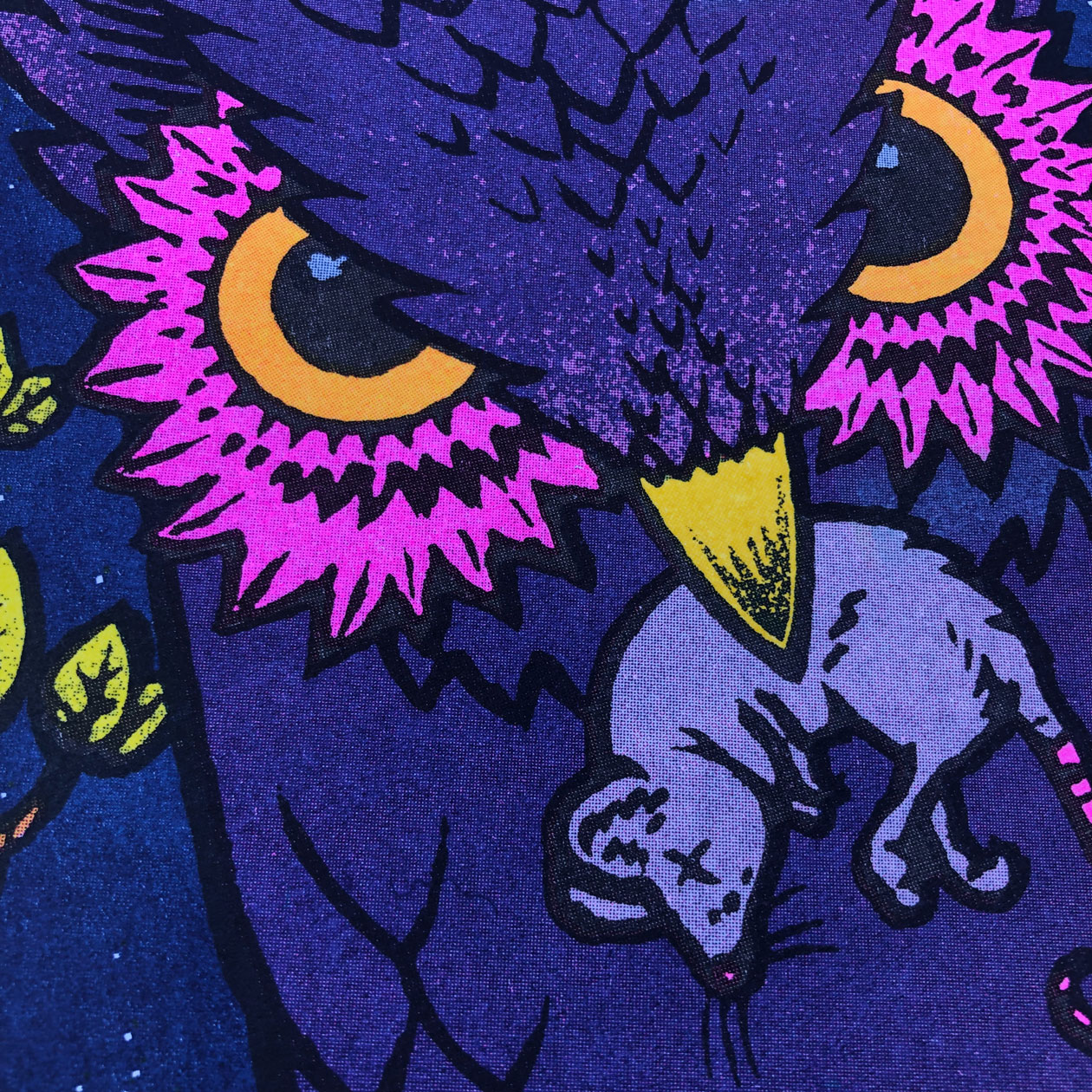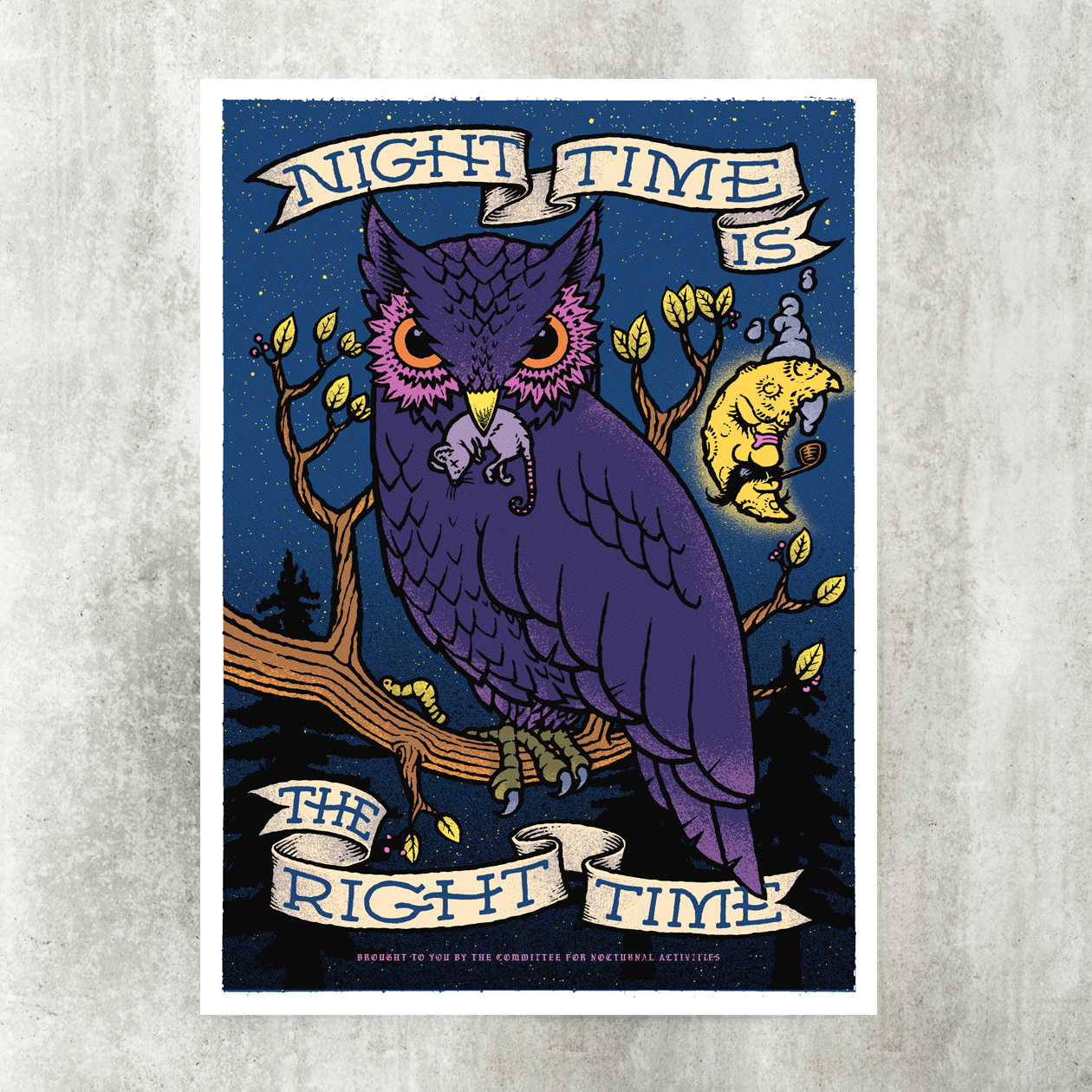 The nocturnal wise owl spreading the word. 4-color riso print on A3 format in yellow, fluorescent pink, federal blue and black.